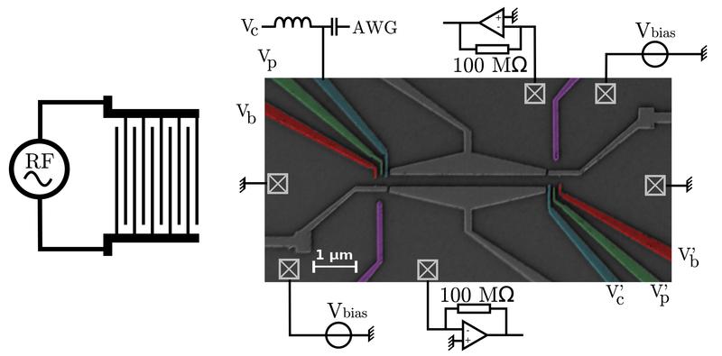 Schematische Aufsicht auf die experimentelle Anordnung mit Elektronen-Mikroskop-Bild einer Probe, die an der Ruhr-Universität Bochum durch Molekularstrahl-Epitaxie hergestellt, in Tokyo strukturiert und in Grenoble vermessen wurde. Bild: RUB