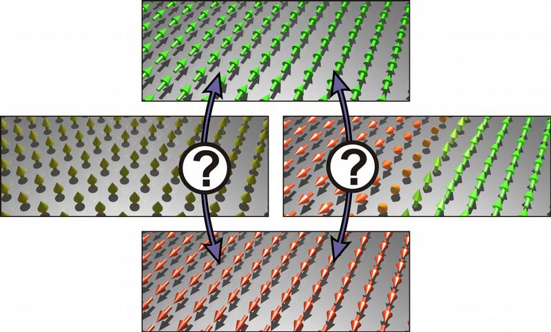 Um den Magneten zwischen seinen Grundzuständen (oben, unten) zu schalten, können sich entweder alle magnetischen Spins gemeinsam drehen (links), oder die Ummagnetisierung wird über einen komplexen Mechanismus realisiert, bei dem die magnetischen Spins reihenweise rotieren (rechts). Die gemeinsame parallele Ausrichtung der Spins wird dafür kurzzeitig aufgegeben. Forschungsgruppe Prof. Roland Wiesendanger, Universität Hamburg