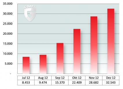 Durchschnittlich alle zwei Minuten ein neuer Android-Schädling - Anzahl neuer Android-Schädlinge im zweiten Halbjahr 2012. Bild: "obs/G Data Software AG"