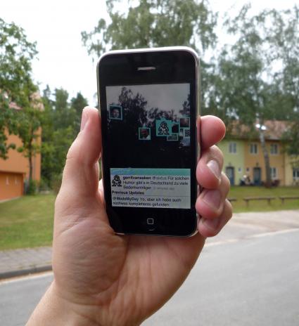 Man bekommt im Display eingeblendet, wer gerade von wo welchen "Tweet" (Twitterbeitrag) mit seinem iPhone versendet hat. Bild: "obs/Fraunhofer IGD"