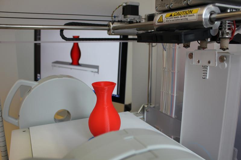 Vorn eine gedruckte Vase, hinten das digitale Modell auf dem Computermonitor. Das wirtschaftliche Po Quelle: (Foto: Marco Wirth) (idw)