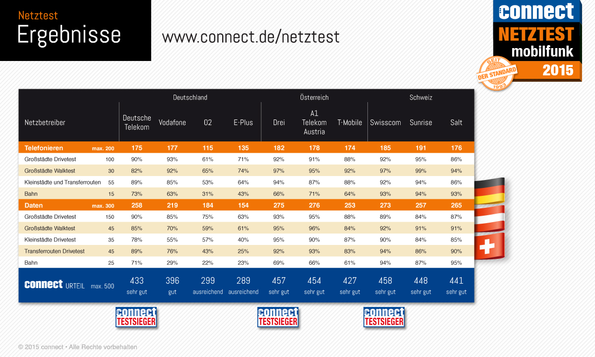 Zurück zu Der connect-Netztest 2015 zeigt, welche Mobilfunknetze in Deutschland, Österreich und der Schweiz die Nase vorn haben