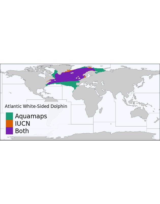 Die Web-App ermöglicht es, Karten aus den beiden maßgeblichen Datenbanken zur globalen Verbreitung von Meerestieren, hier am Beispiel des Weißseitendelfins, miteinander zu vergleichen.