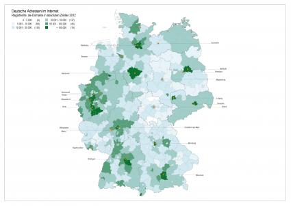 Deutsche Adressen im Internet. Registrierte .de-Domains in absoluten Zahlen 2012. Die regionale Verteilung von .de in Deutschland 2012 - Trends setzten sich fort.