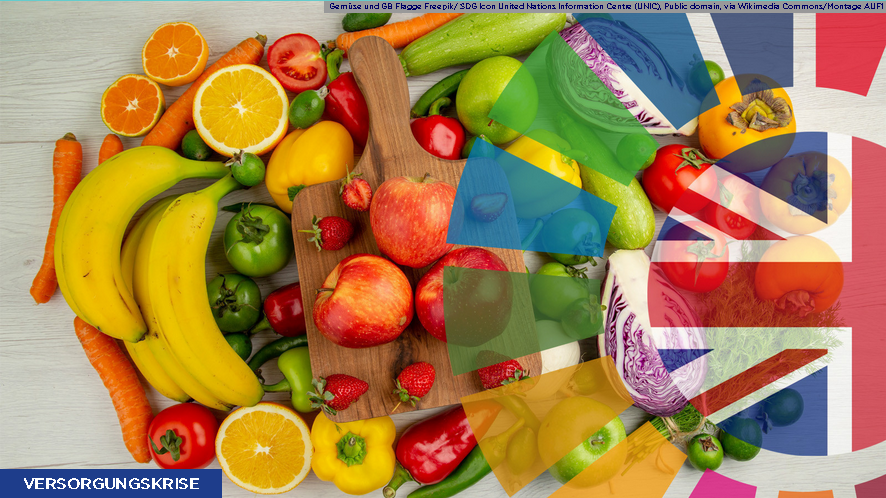 Bild: Gemüse und GB Flagge Freepik/ SDG Icon United Nations Information Centre (UNIC), Public domain, via Wikimedia Commons/Montage AUF1 / Eigenes Werk