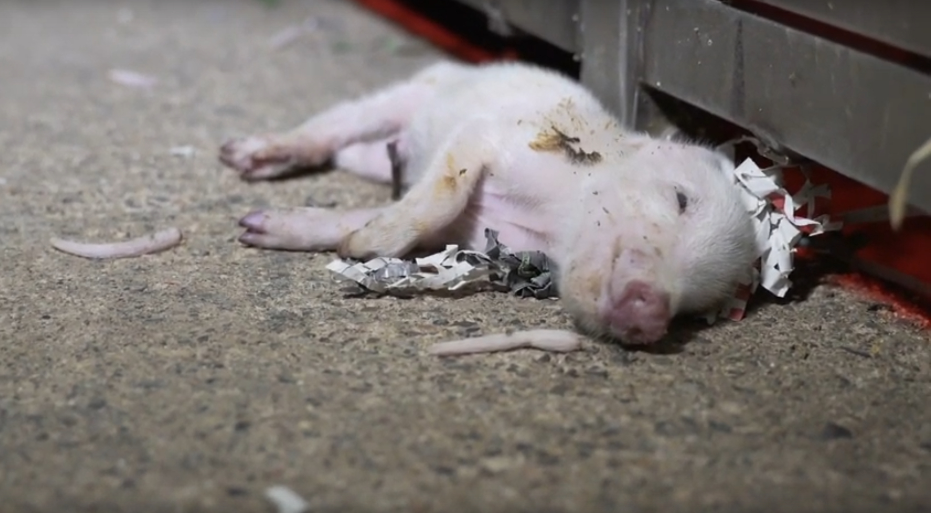 Ferkel und Mütter werden in dunklen Ställen eingespeert, mit praktisch keiner Bewegungsfreiheit, mit Insekten und Kadavern.