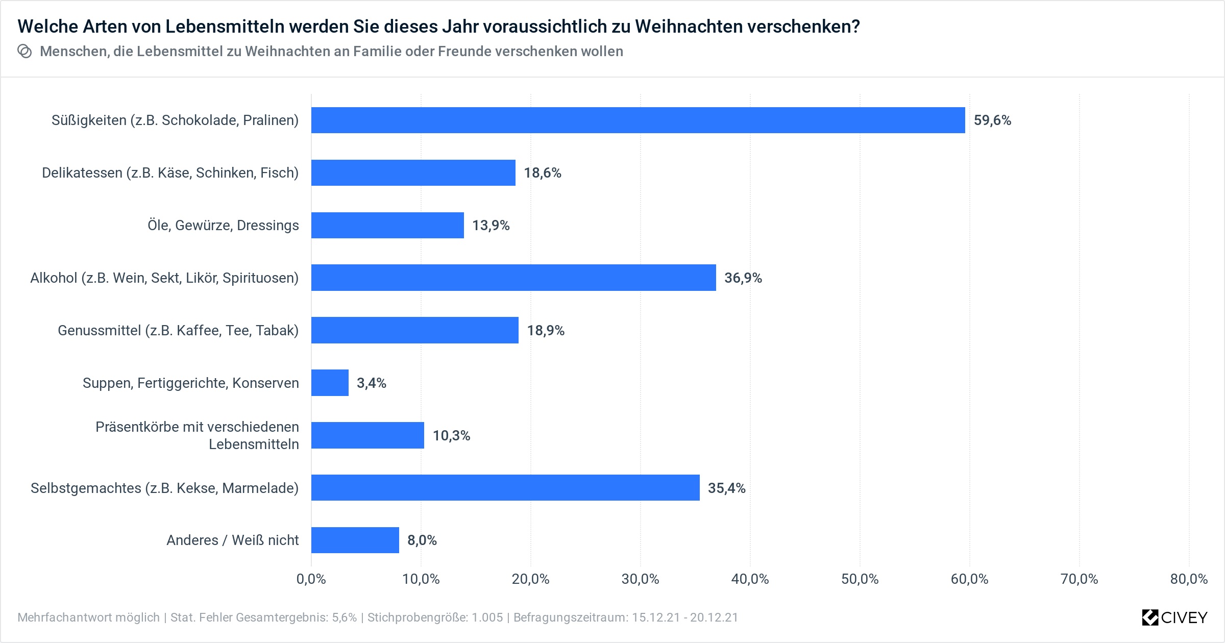 Welche Arten von Lebensmitteln werden Sie dieses Jahr voraussichtlich zu Weihnachten verschenken? Bild: BVE Bundesvereinigung d. Dt. Ernährungsindustrie Fotograf: BVE Bundesvereinigung d. Dt. Ernährungsindustrie