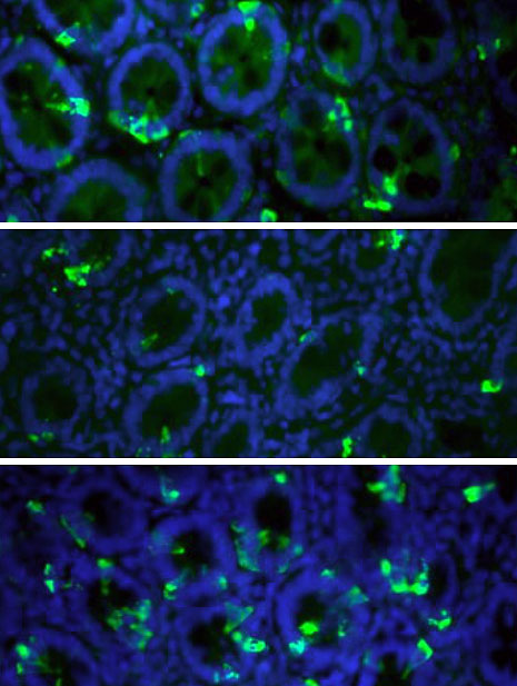 Gewebeschnitte des Zwölffingerdarms: Zellen, die Sättigungsbotenstoffe freisetzen können, sind grün markiert.