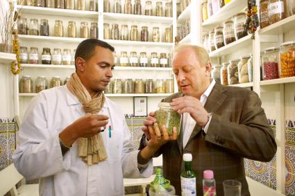 In der Gewürz-Apotheke von Ahmed Beharat (links im Bild) in Marrakesch erhalten Menschen seit Jahrhunderten bewährte Medizin. Hier erfährt Sternekoch Alfons Schuhbeck zum Beispiel alles über die Heilkraft des Schwarzkümmels. Bild: "obs/Verlag Zabert Sandmann GmbH"