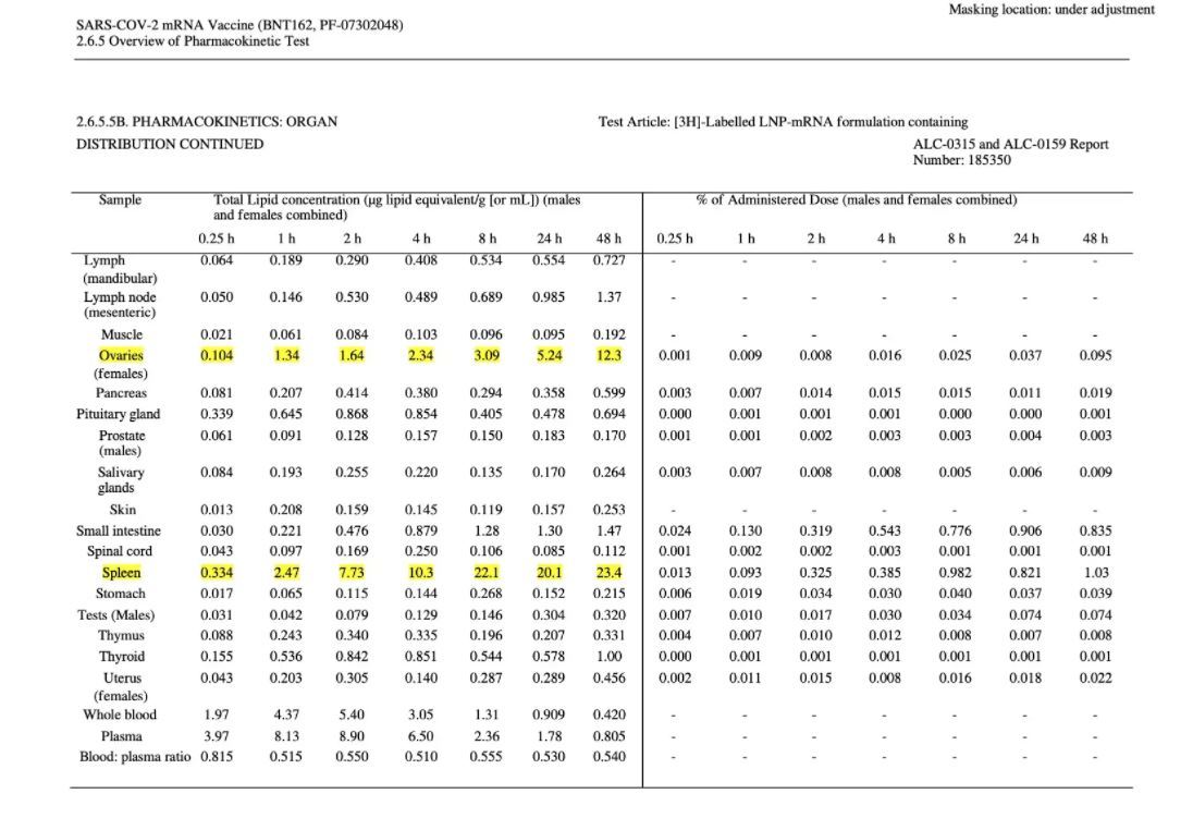 Screenshot von einem Datenblatt der japanischen Zulassungsbehörde zum Pfizer/BioNTech-Impfstoff. Dokumentiert wird in der Tabelle, wie sich das Spike-Protein in verschiedenen Organen anreichert, wohin es eigentlich nach Herstellerangaben gar nicht gelangen sollte. In gelber Farbe sind die Werte für Eierstöcke (Ovaries) und Milz (Spleen) hervorgehoben Bild: RT DE / Eigenes Werk