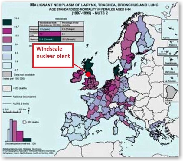 Eurostat Kehlkopf, Luftröhren, Bronchen und Lungenkrebs-Sterblichkeitsraten (1997-1999). Mit mehr als 300 Zwischenfällen erzeugte das AKW Windscale (UK) 76% aller künstlicher Strahlung im Jahr 1984.