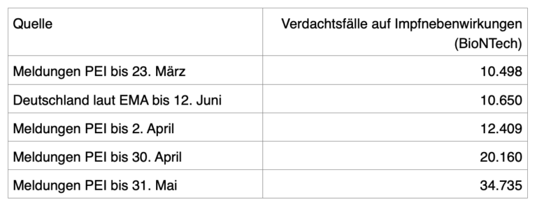 EMA 12. Juni 2021; Paul-Ehrlich-Instituts Sicherheitsberichte Covid-19-Impfstoffe – Das oben angegebene Datum ist hier nicht das Veröffentlichungsdatum, sondern das Datum, bis zu dem Meldungen auf Impfnebenwirkungen erfasst wurden. Bild: Reitschuster / Eigenes Werk