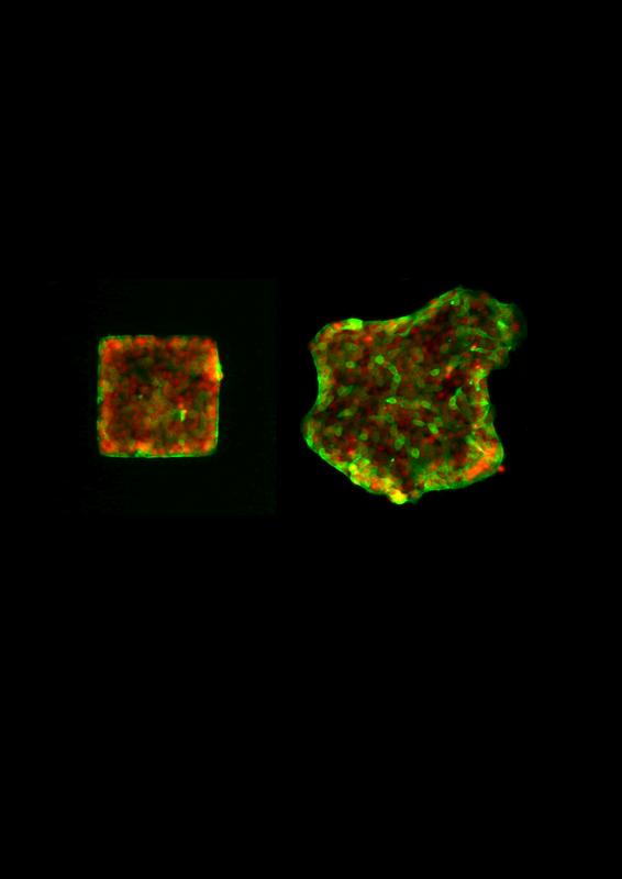 Epithelzellen bewegen sich aus einer ursprünglichen Form (links) kollektiv in die Umgebung (rechts). Die Lokalisation von Merlin ist grün markiert, rot zeigt die Zellkerne. Quelle: Abbildung: Max-Planck-Institut für Intelligente Systeme (idw)