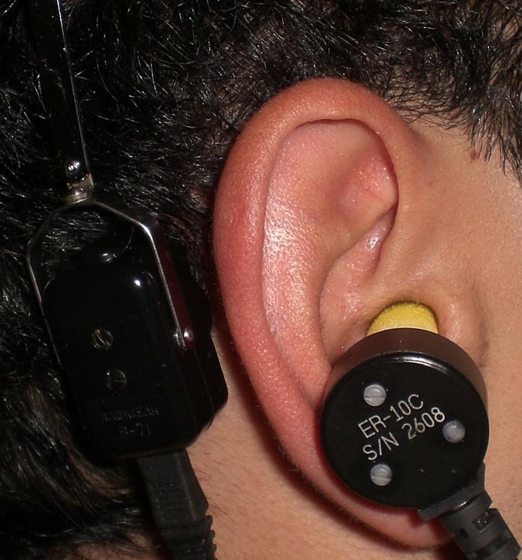 Alternative Tonerzeugung mithilfe eines Knochenhörers (hinterm Ohr) und eines Sondenlautsprechers (im Ohr) Quelle: (Foto: PTB) (idw)