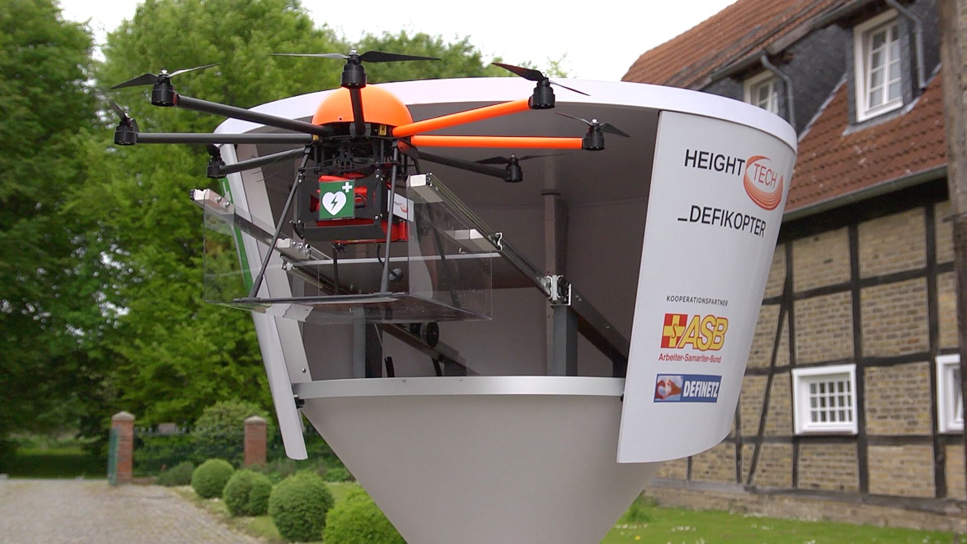 Eine Drohne, an der ein Defibrillator befestigt ist, startet. Der sogenannte Defikopter wirft das lebensrettende Gerät über ländlichen Gebieten oder unwegsamem Gelände ab. / ASB fordert Einbindung von Defikoptern in den Rettungsdienst / Schnelle Hilfe aus der Luft kann Leben retten / Weiterer Text über ots und www.presseportal.de/nr/6532 / Die Verwendung dieses Bildes ist für redaktionelle Zwecke honorarfrei. Veröffentlichung bitte unter Quellenangabe: "obs/ASB-Bundesverband/ASB Deutschland e.V."