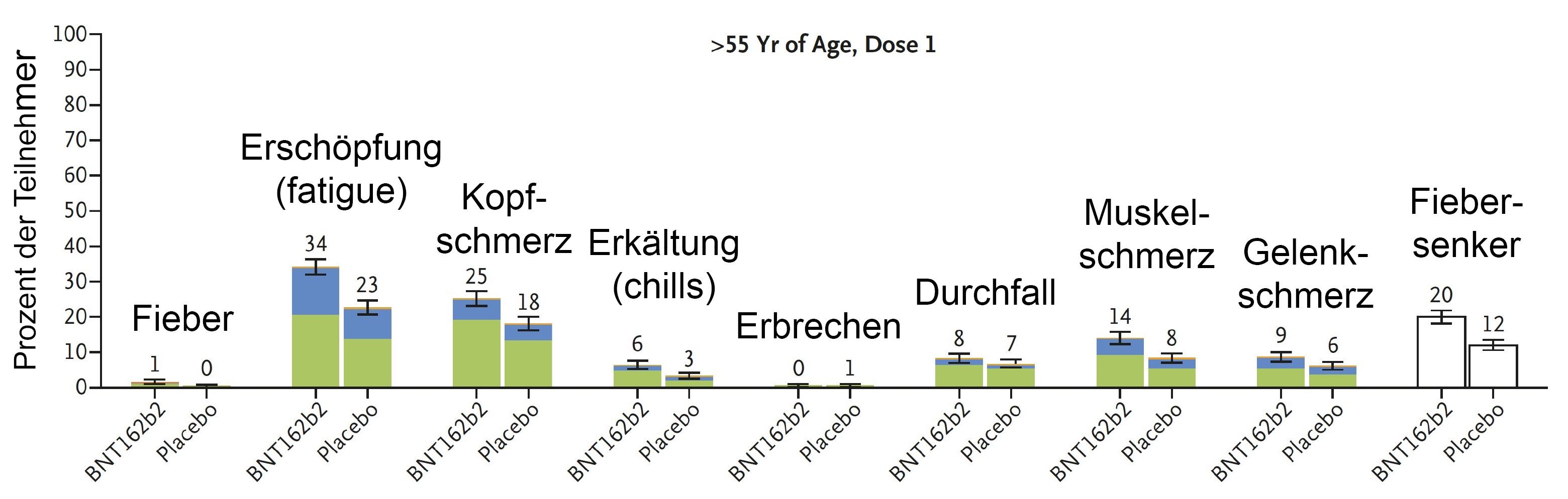 Abb. 9: Systemische Nebenwirkungen bei Teilnehmern älter als 55 Jahre, nach der ersten Dosis Bild: Impfkriti.de.