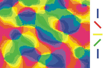 Karte der Orientierungspräferenz: Nervenzellen in der Sehrinde reagieren bevorzugt auf Kantenverläufe in einer bestimmten Richtung. Zellen, die auf die gleiche Richtung reagieren, sind in dieser Darstellung jeweils mit einer Farbe eingefärbt. Bild: S. Löwel/ Universität Jena