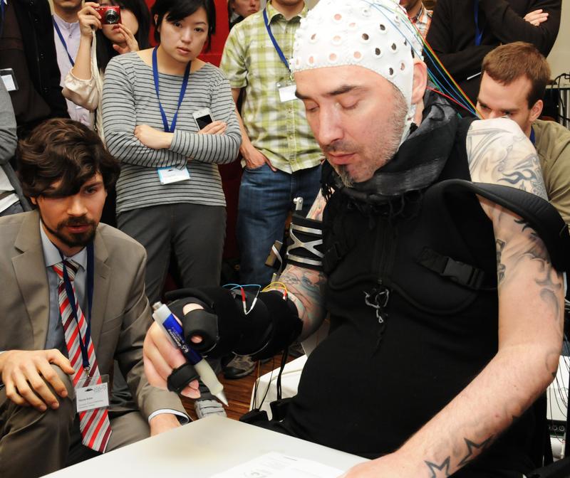 Tilo Werner ist seit mehr als zwei Jahren vom Hals an querschnittsgelähmt. Dass er mit Hilfe moderner Technik dennoch wieder greifen und seinen Arm bewegen kann, hat er auf einem Workshop in Würzburg demonstriert. Quelle: (Foto: Gunnar Bartsch) (idw)