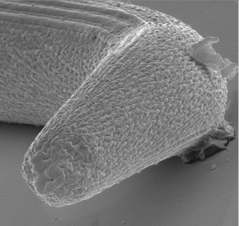 Vorderende einer infektiösen Strongyloides-Larve (Raster-EM-Aufnahme)) Quelle: (© Adrian Streit) (idw)