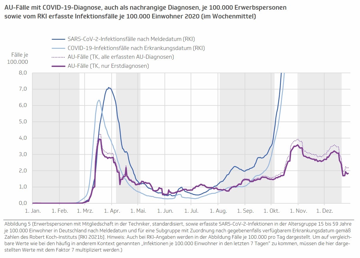 Anlage 1: AU-Meldungen bei der TKK hochgerechnet auf Fälle je 100.000 im Vergleich zu den gemeldeten Infektionszahlen laut RKI 2020 Bild: TKK Gesundheitsreport 2021 / Eigenes Werk