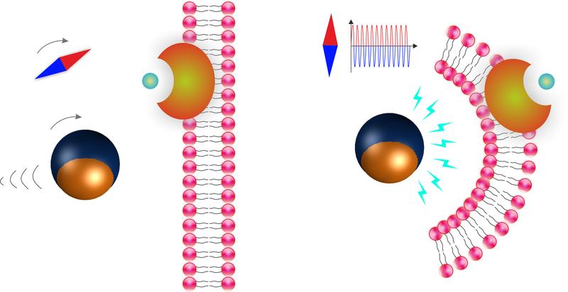 Ein Mikroroboter wird mit einem Magnetfeld zu einer Zelle gesteuert (l.). Durch eine Veränderung des Magnetfelds - dargestellt als Kompassnadel - erzeugt der Roboter ein elektrisches Feld. Quelle: Grafik: ETH Zürich / Salvador Pané (idw)