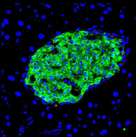 Langerhans'sche Insel des Pankreas mit Insulin-produzierenden Zellen (grün). Quelle: MPI f. Herz- und Lungenforschung (idw)