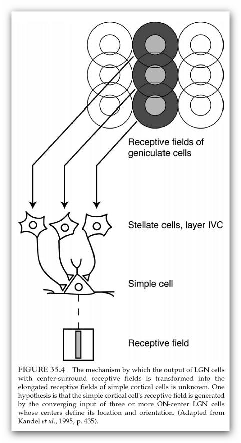 Von MV-Kugeln zu MV-Fäden? Die Umwandlung von kreisrunden rezeptiven Feldern in längliche rezeptive Felder. Quelle: Paxinos, Geroge; Mai, Jürgen K.: The Human Nervous System (2. Aufl.), San Diego: Academic Press 2004, S. 1287