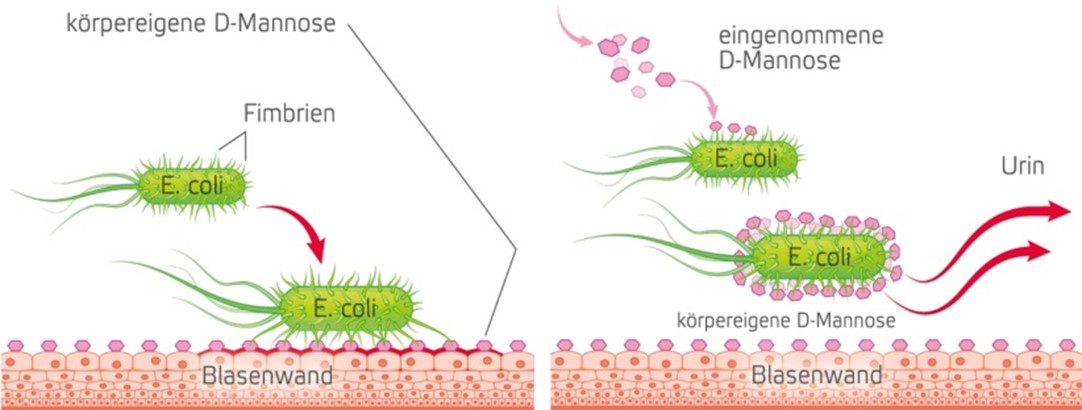 D-Mannose ummantelt die E. coli Bakterien und verhindert so, dass sie sich an der Blasenwand festsetzen Bild: Cassella-med GmbH & Co. KG Fotograf: Cassella-med GmbH & Co. KG
