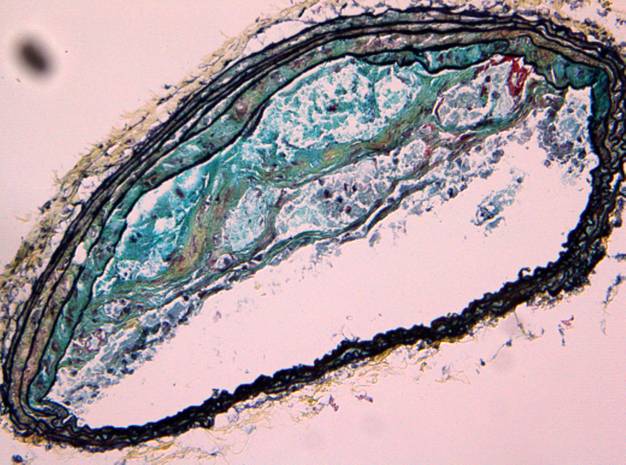 Ob eine Ablagerung (Plaque) in einem Blutgefäß - hier im Querschnitt - zum Gefäßverschluss führt, hängt auch von ihrer Stabilität ab. Eine instabile Plaque. Quelle: Universitätsklinikum Heidelberg