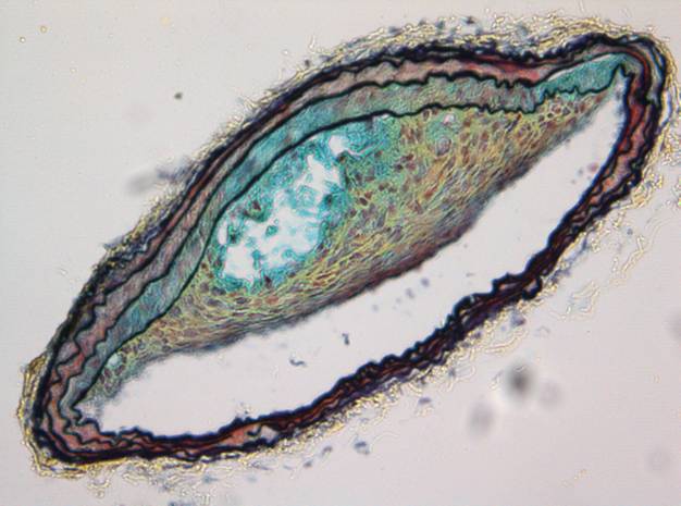 Ob eine Ablagerung (Plaque) in einem Blutgefäß - hier im Querschnitt - zum Gefäßverschluss führt, hängt auch von ihrer Stabilität ab. Eine stabile Plaque bei der Maus. Quelle: Universitätsklinikum Heidelberg.