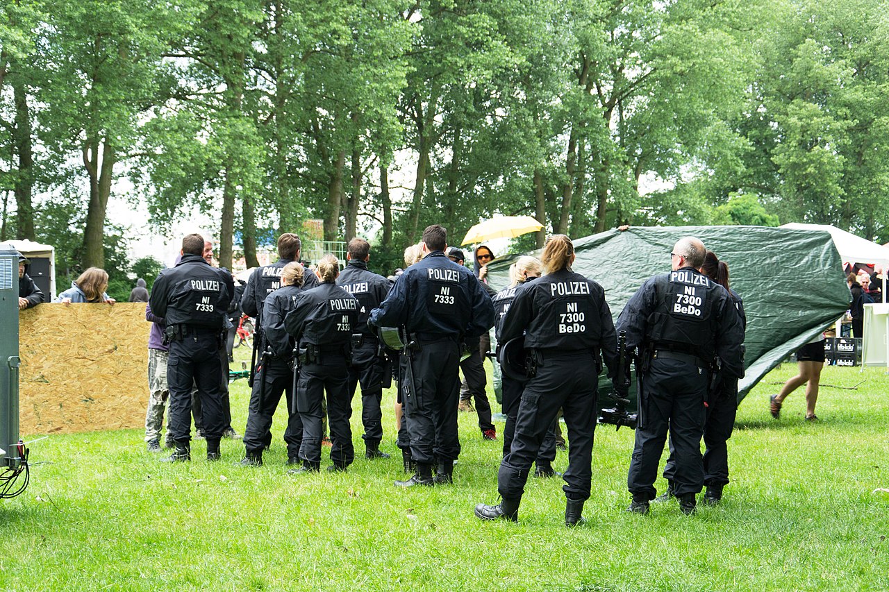 Polizisten inspizieren das G20-Protestcamp Entenwerder nach der illegalen Räumung