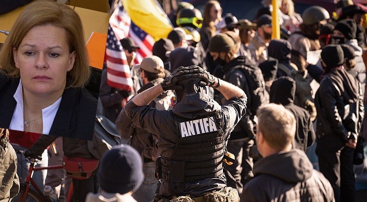 Bild: Faeser: Olaf Kosinsky, Wikimedia, CC BY-SA 3.0; Foto ANTIFA: Chad Davis, Wikimedia, CC BY 2.0; DE, Bilder zugeschnitten, Montage: Wochenblick/Eigenes Werk