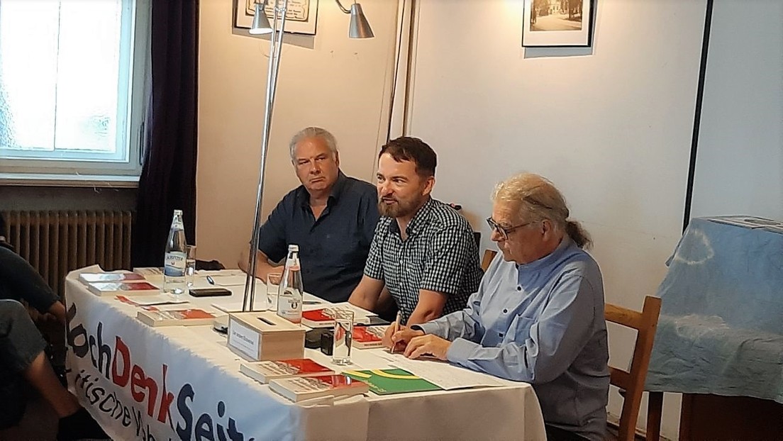 Autor des Buches "Die (Selbst)Zerstörung der deutschen Linken" Sven Brajer (Mitte), MdB Andrej Hunko (links) und Verleger Hannes Hofbauer bei einer Podiumsdiskussion in Berlin-Moabit (2023). Bild: RT / Wladislaw Sankin