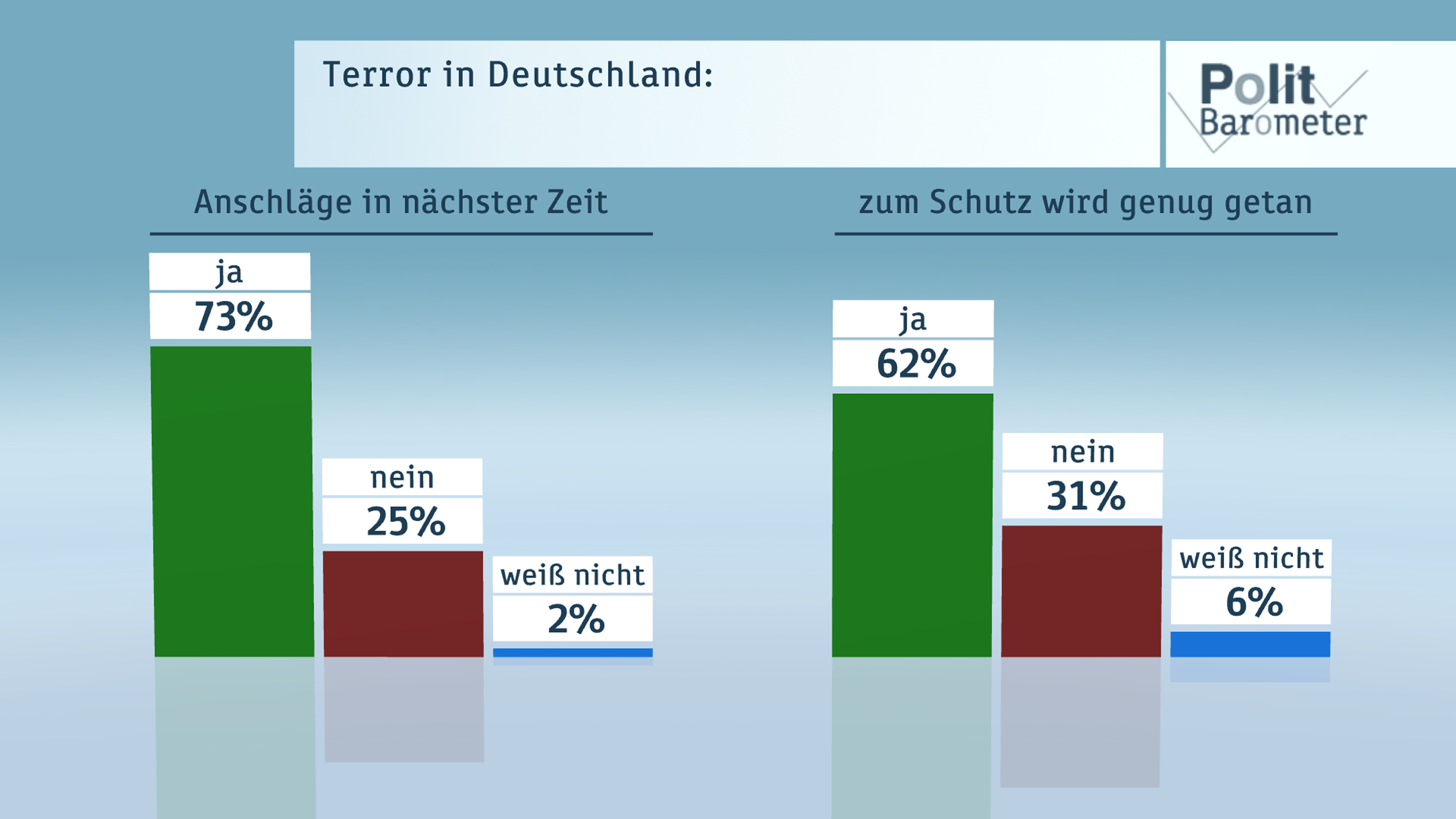 Zurück zu ZDF-Politbarometer Oktober I 2016: Terrorangst: Knapp drei Viertel fürchten Anschläge in nächster Zeit