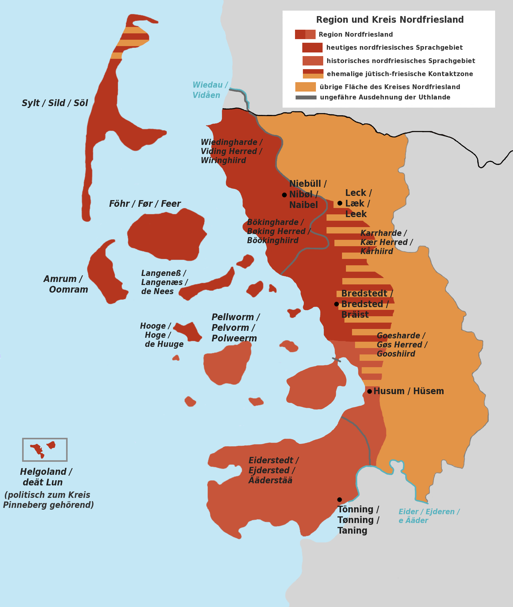 Nordfriesland: Unterschied zwischen der Region (rot) und dem größeren Kreis, der über das eigentliche nordfriesische Besiedlungsgebiet hinausragt. Helgoland ist Teil des Kreises Pinneberg.