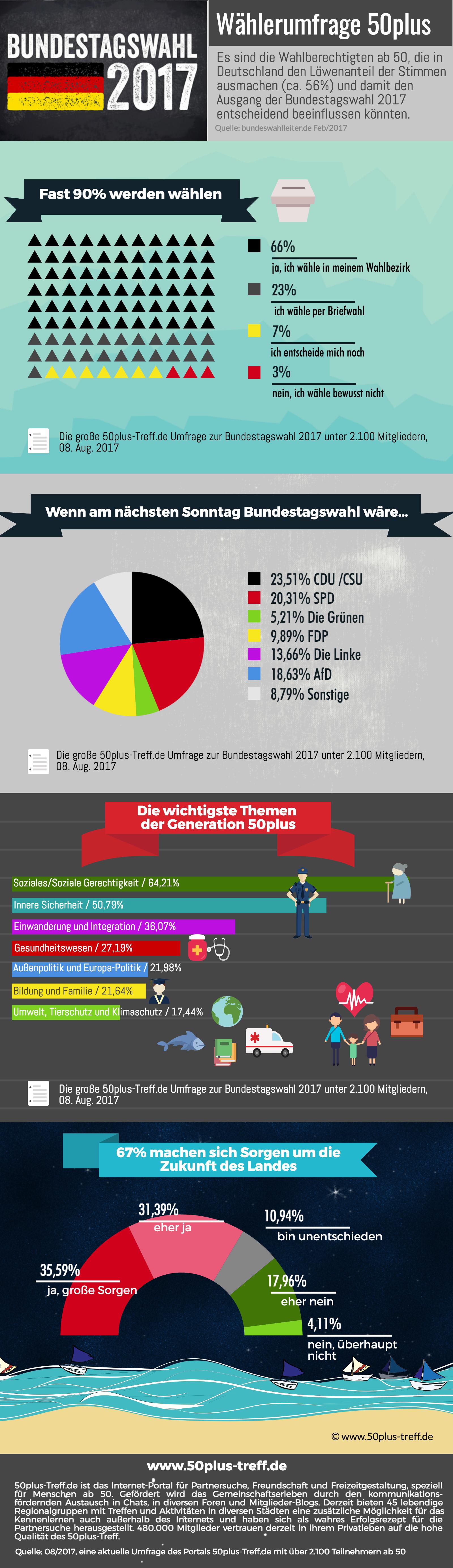 Wahlumfrage 50plus: Deutschlands größte Wählergruppe macht sich Sorgen um Zukunft des Landes / Note 4 für aktuelle Regierungsarbeit, AfD drittstärkste Partei, soziale Gerechtigkeit wichtiges Wahlthema / 50plus-Treff.de-Umfrage zur Bundestagswahl 2017. Bild: "obs/50plus-Treff.de/(c) 50plus-Treff.de"