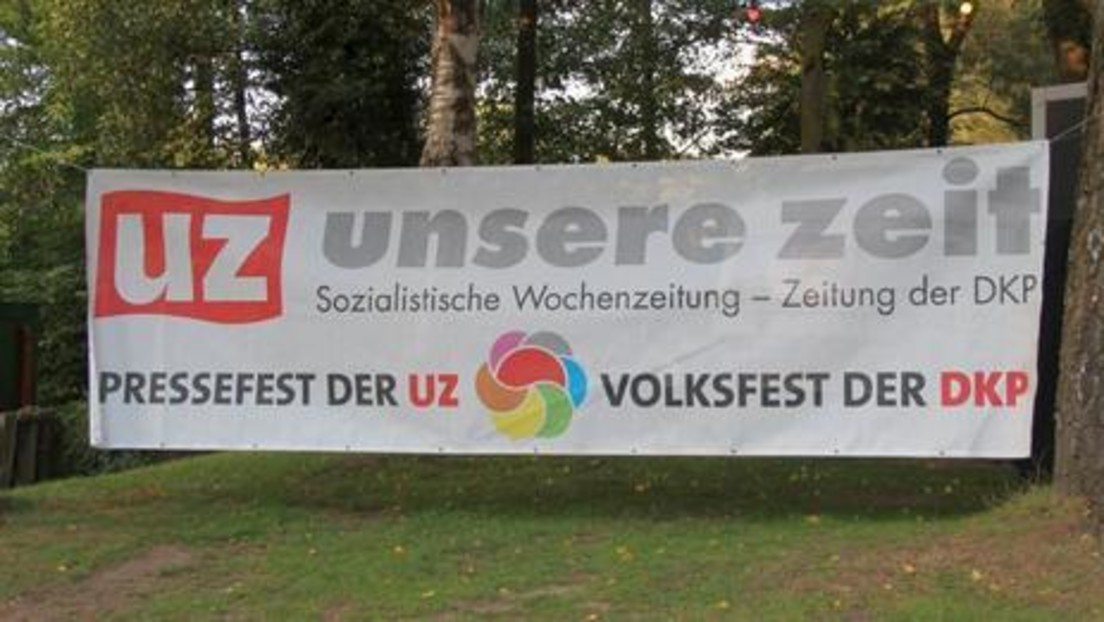Ein Transparent auf dem UZ-Pressefest im Revierpark Dortmund 2018