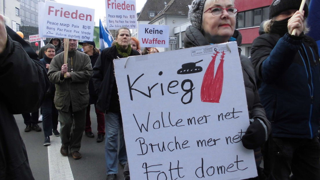 Friedensplakat auf Kölsch: "Krieg wollen wir nicht, brauchen wir nicht, weg damit!", Köln, 4.02.2023 Bild: Felicitas Rabe