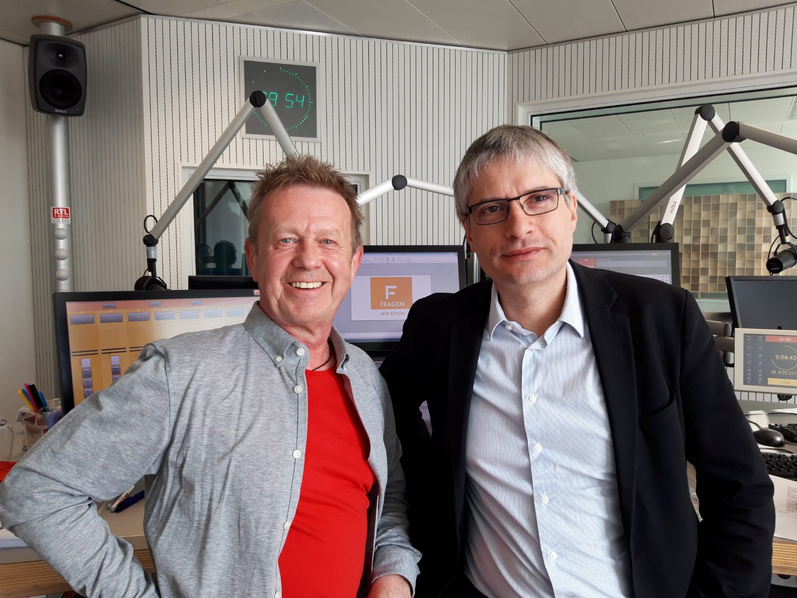"FRAGEN WIR DOCH!"-Moderator Helmer Litzke mit GRÜNEN-Politiker Sven Giegold im RTL Radio-Studio in Berlin. Bild: "obs/MAASS-GENAU - Das Medienbüro/Helmer Litzke, RTL Radio"