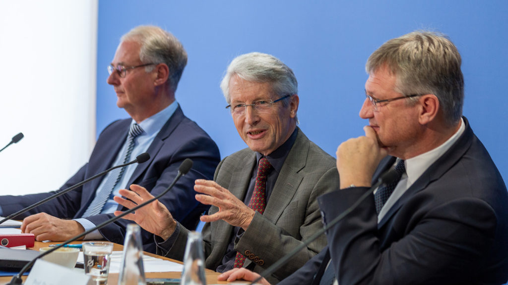 Dr. Roland Hartwig, Prof. Dr. Dietrich Murswiek, Prof. Dr. Jörg Meuthen (v.l.n.r) auf der Pressekonferenz zum Thema "AfD wehrt sich gegen die Vorwürfe des Verfassungsschutzes" am 7. November 2019