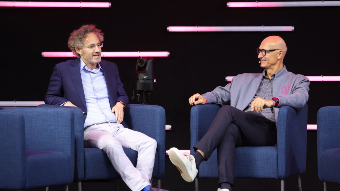 Alex Karp, CEO von Palantir Technologies, und Timotheus Höttges, CEO der Deutschen Telekom, während der Digital-X-Veranstaltung am 7. September 2021 in Köln.