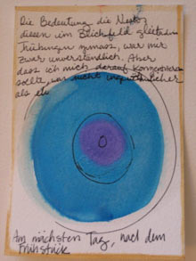 Bild 3: Christi, To be continued, Gouache und Tinte auf Papier, 2006. Das Bild zeigt eine grosse Leuchtkugel zwischen einem Auszug aus dem dritten Kapitel von „Mouches Volantes. Die Leuchtstruktur des Bewusstseins.“