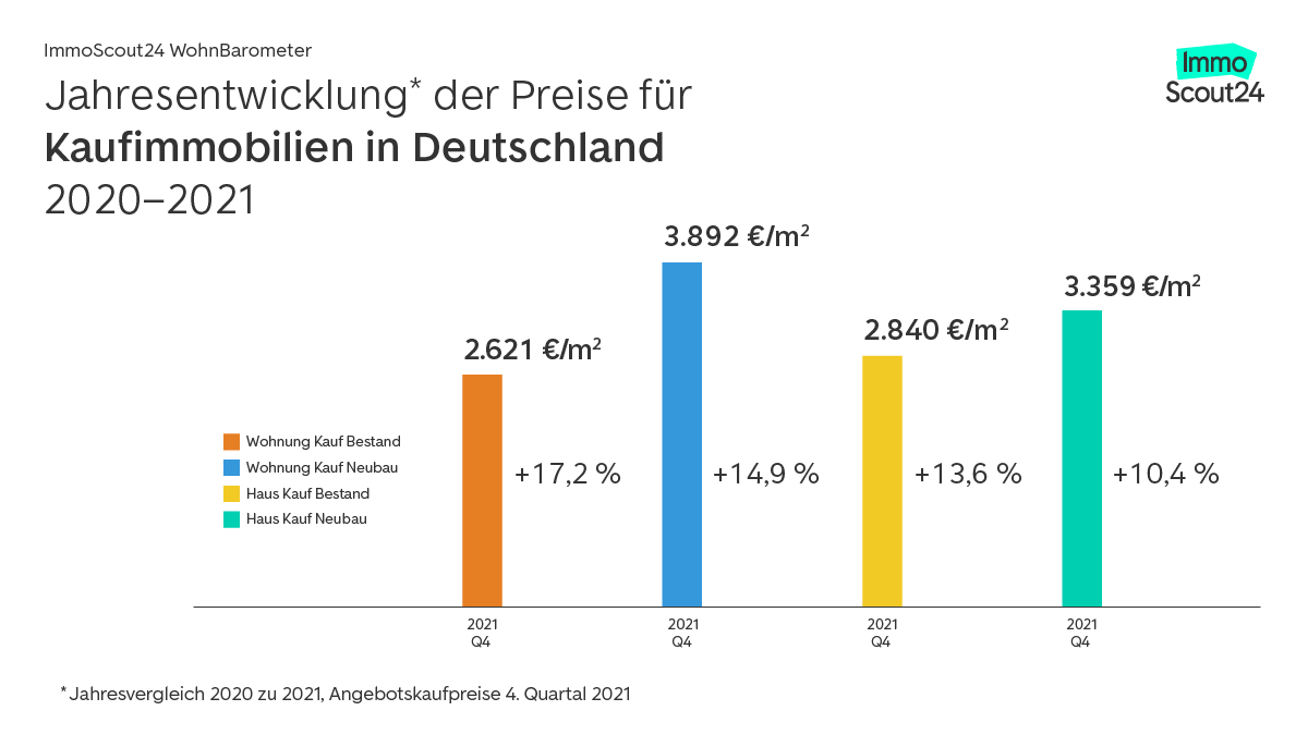 Zurück zu ImmoScout24 WohnBarometer: Kaufpreise zogen bundesweit in 2021 wieder kräftiger an