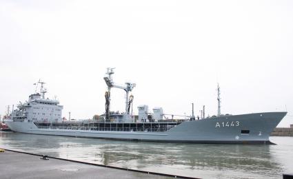 Der Betriebsstofftransporter A 1443 Rhön verlässt den Marinestützpunkt Wilhelmshaven um sich in Lissabon der Standing NATO Martime Group 1 (SNMG 1) anzuschließen. Der Betriebsstofftransporter Rhön ist 130,5 Meter lang.
