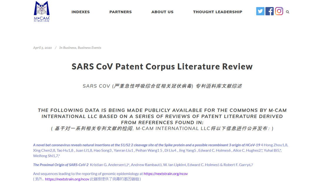 Dokumentation von Patenten zu SARS-CoV, die laut einem auf Innovationen spezialisierten Unternehmen aus den USA auch im Zusammenhang mit der aktuellen Corona-Krise von Bedeutung sein sollen