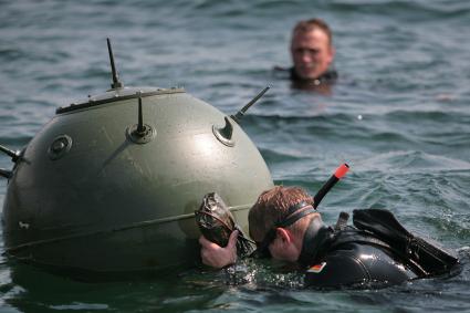 Anbringen einer Sprengladung an eine Ankertaumine durch 2 Minentaucher Minentaucher während des Medientages in Eckernförde