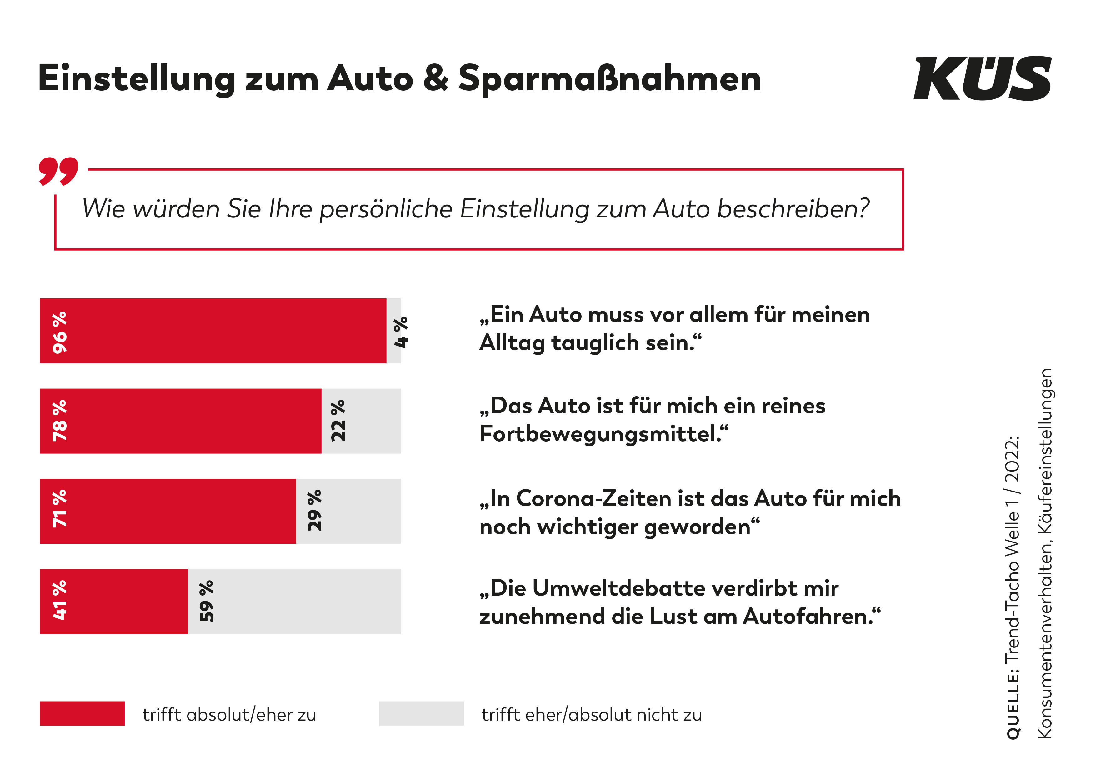 KÜS: Wird jetzt gespart? Wie stehen die Deutschen zum Auto? - Der Trend-Tacho hat nachgefragt / Umweltschutz ein Thema / Nur mäßiges Interesse an Neuwagen / Im KÜS Trend-Tacho wird, unter anderem, auch die persönliche Einstellung der Pkw-Fahrer zum Auto erfragt.