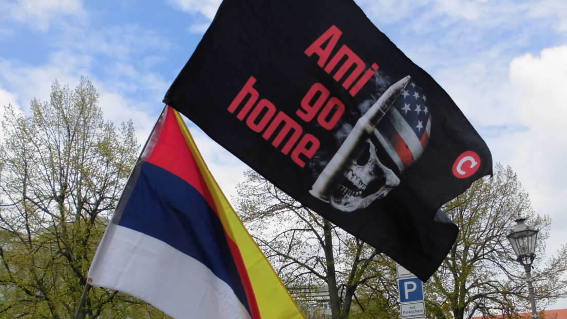 "Ami Go Home": Eine Friedensdemo in Magdeburg (29. April 2023) Bild: Felicitas Rabe