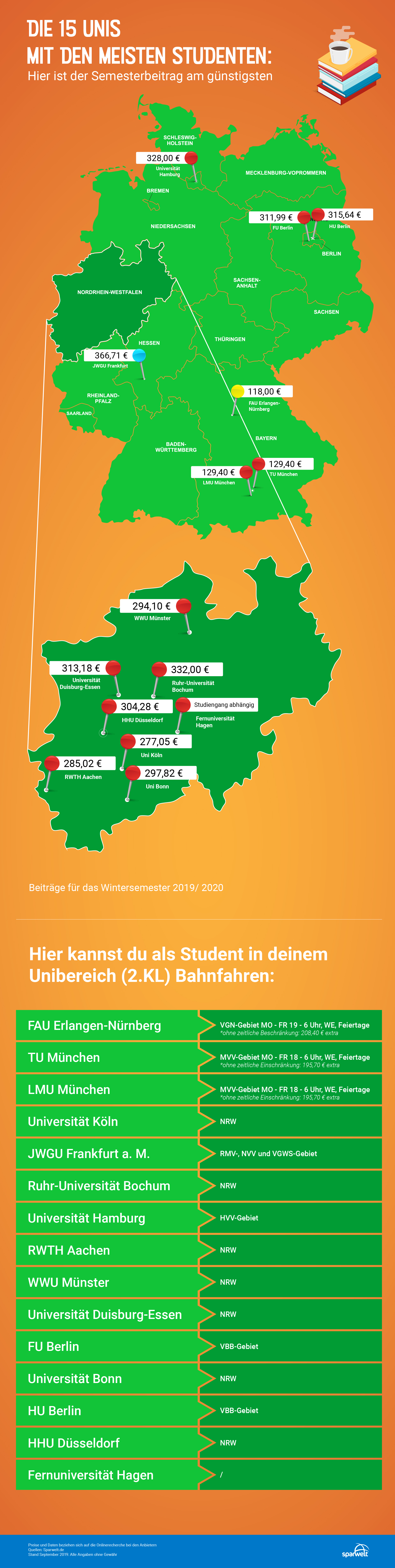 Semesterbeiträge der 15 größten Universitäten: An dieser Uni bezahlen Studierende am meisten / Infografik Semestergebühren und ÖPNV-Tickets. Bild: "obs/Sparwelt.de"
