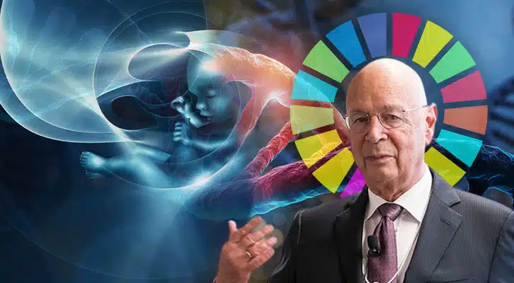 Bild: Fetus & DNA-Strang: Freepik (2); Schwab: Foundations World Economic Forum, CC BY 2.0, via Wikimedia Commons; Collage: Wochenblick / Eigenes Werk